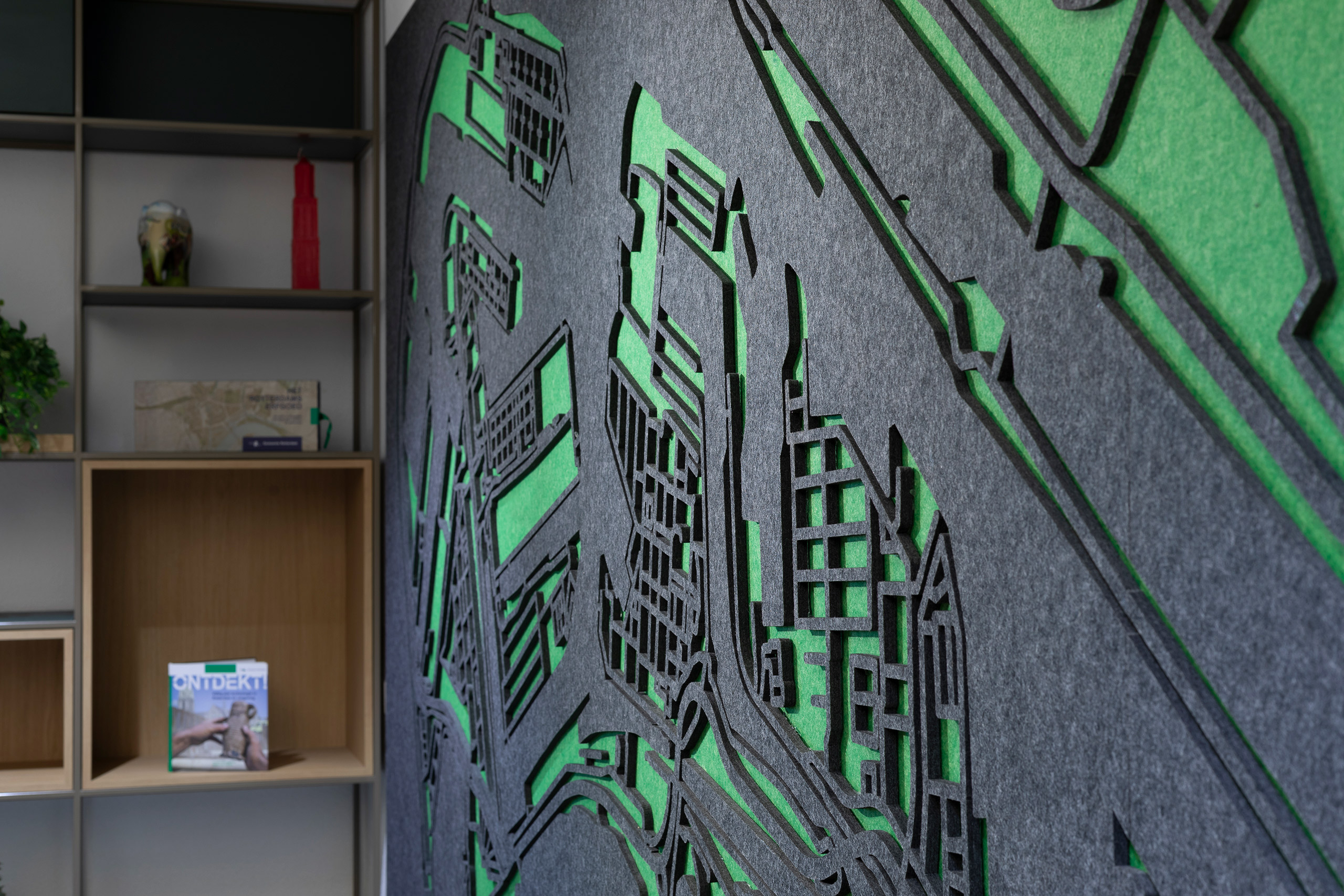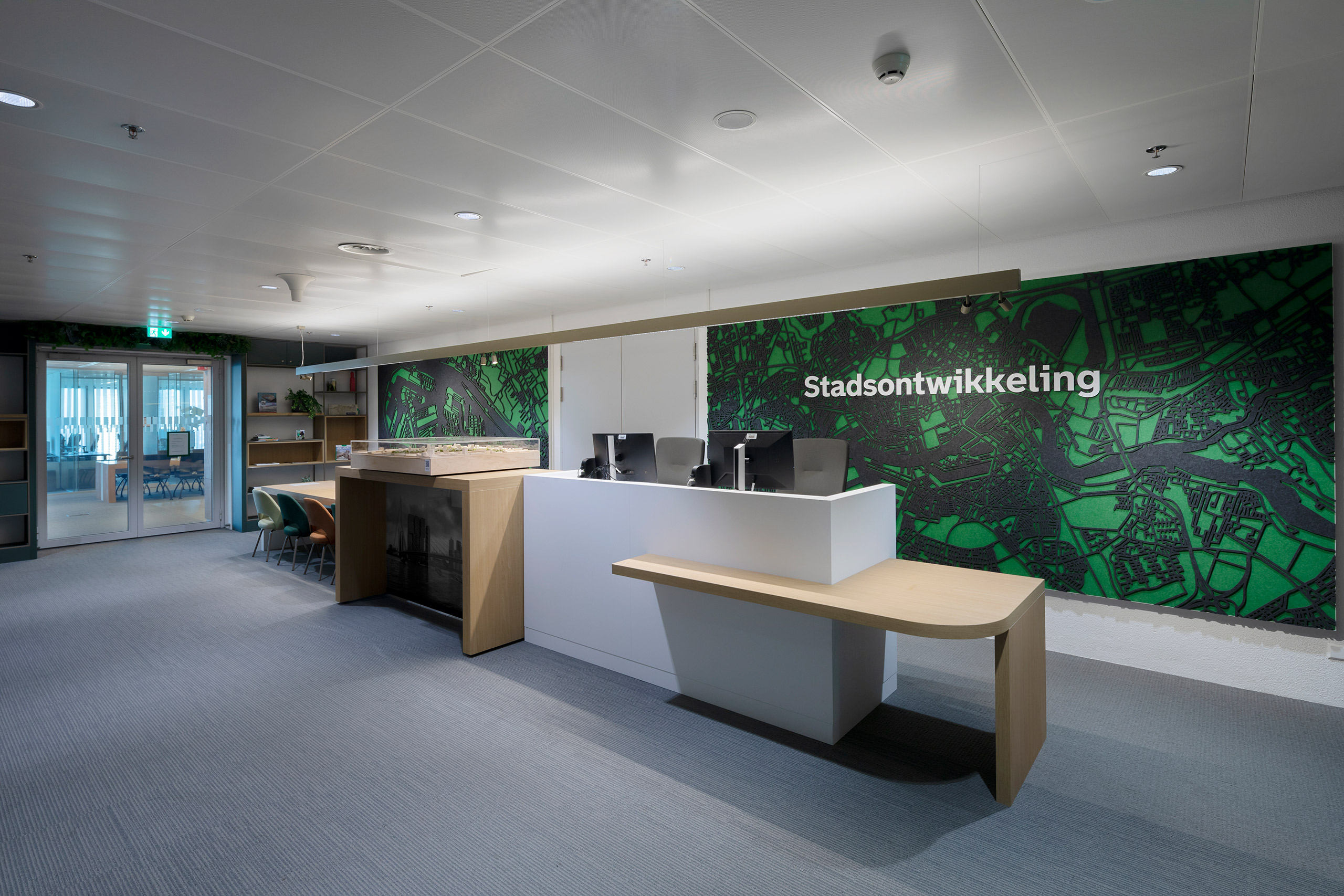 De afdeling Stadsontwikkeling heet je hartelijk welkom op de representatieve etage. Met deze nieuwe ontvangst is de identiteit van het cluster meteen duidelijk: hier wordt aan de stad in haar totaal gewerkt. Met publicaties, maquettes, de grote plattegrond plus het multifunctionele meubel kunnen gasten en medewerkers overleggen, aanlanden, ontvangen worden of kennis opdoen.