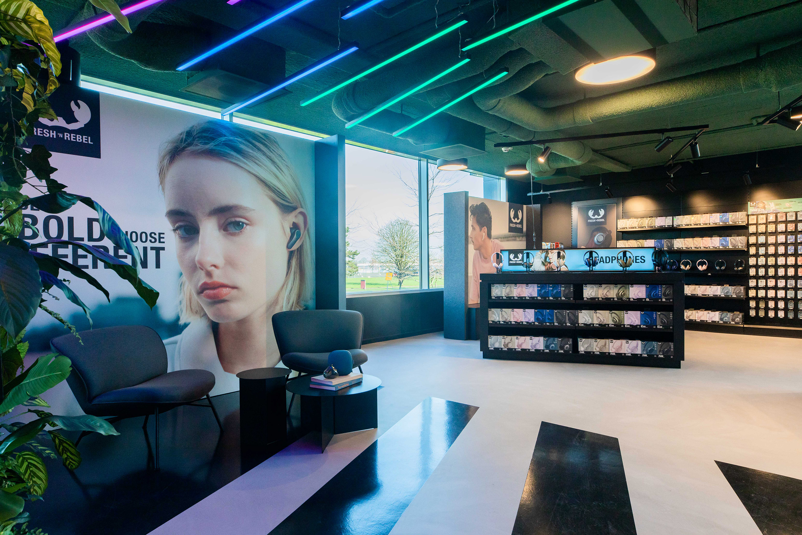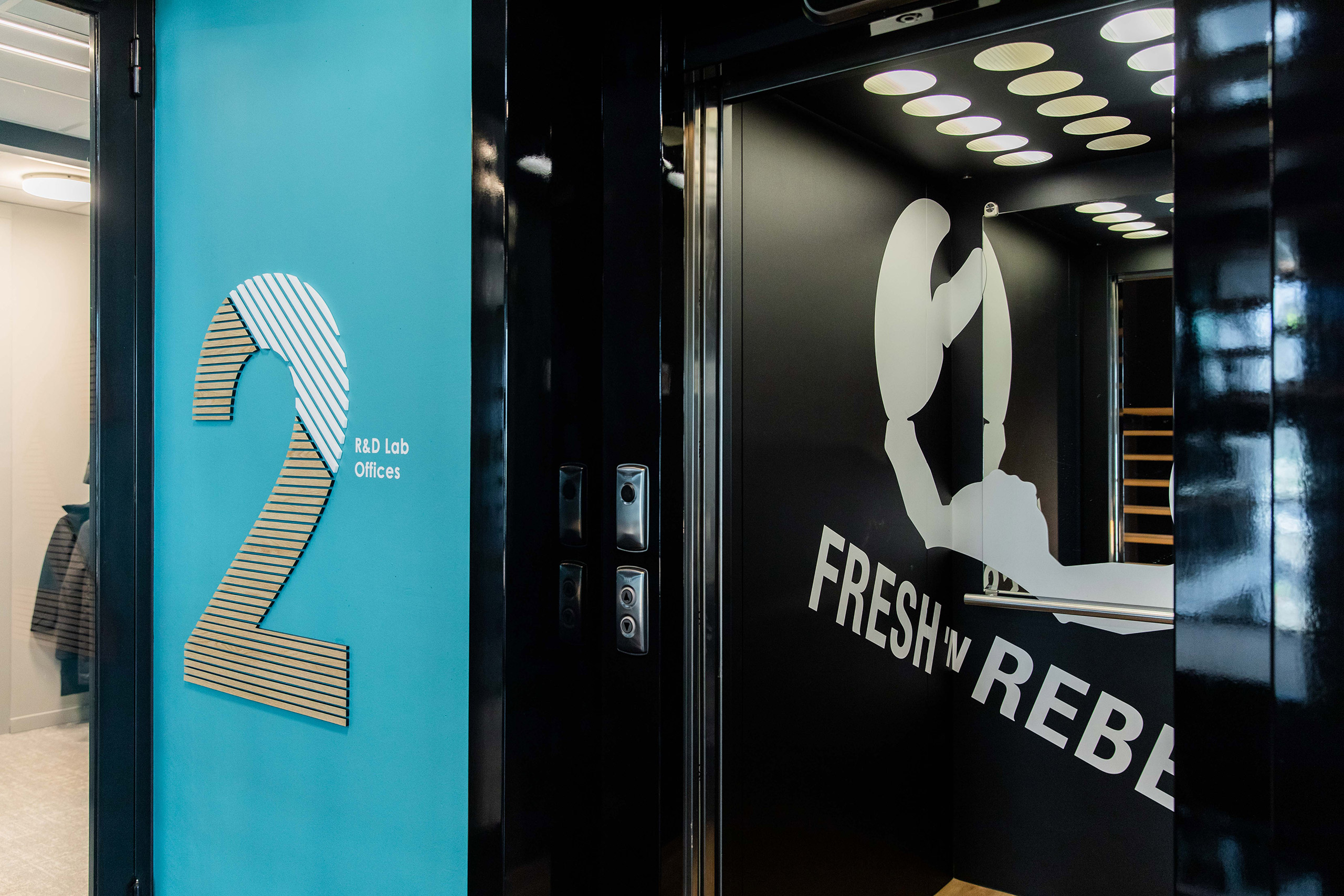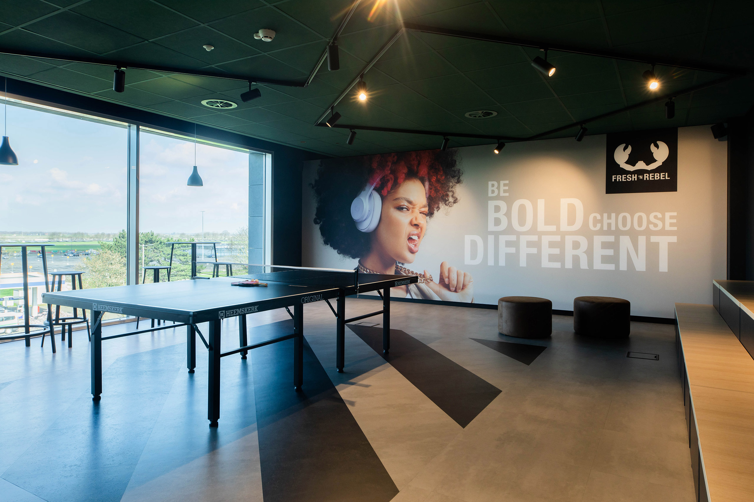 Een stoere mix van showroom en kantoor. Door de verhuizing naar een minder centraal gelegen plek is het meest belangrijke om een uitnodigend kantoor te maken dat de identiteit van Fresh overal uitstraalt. Van entree tot trappenhuis, overal voel je dat je bij Fresh ’n Rebel bent. Medewerkers komen daardoor graag naar kantoor, en zijn trots op hun eigen merk.