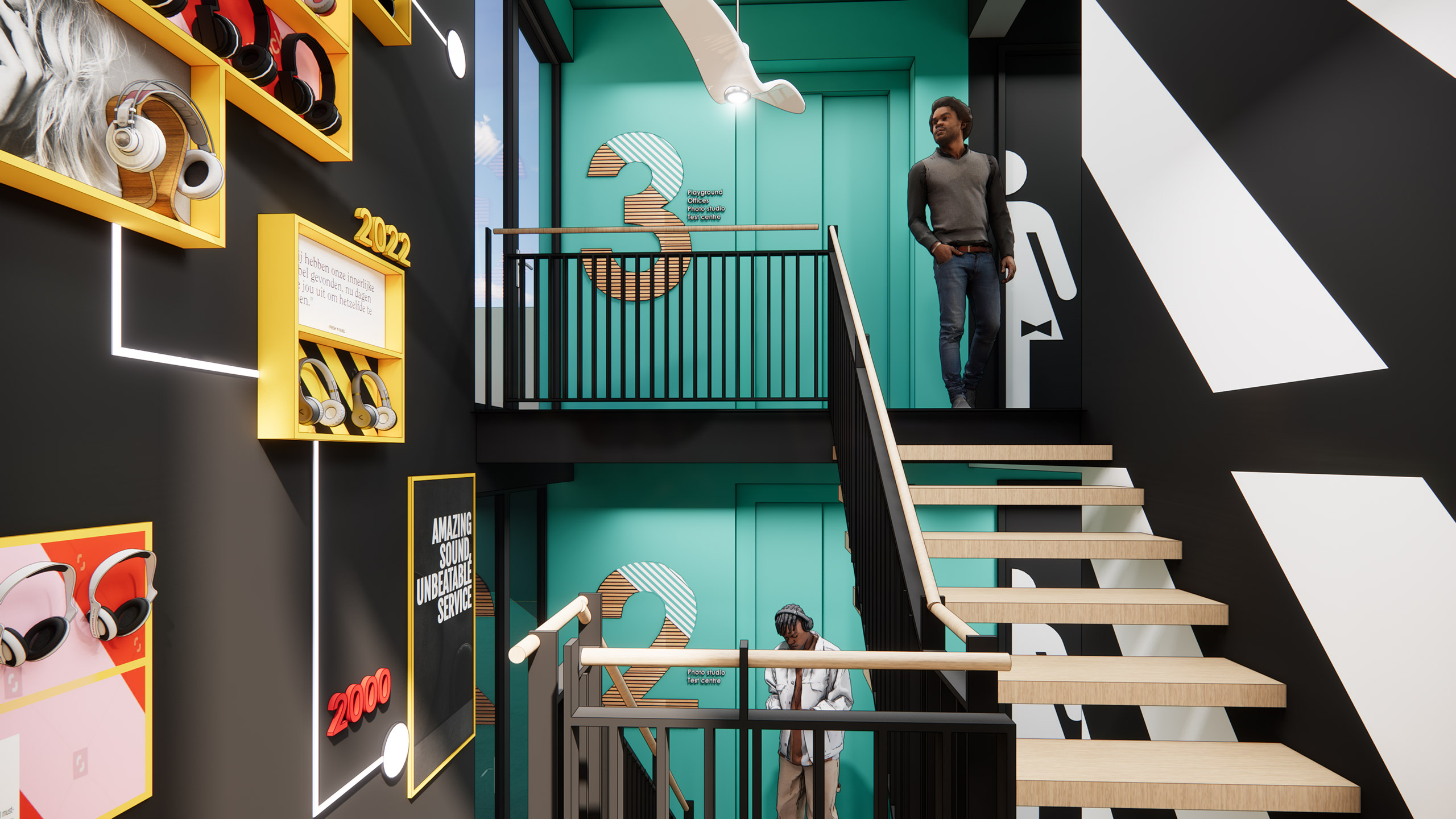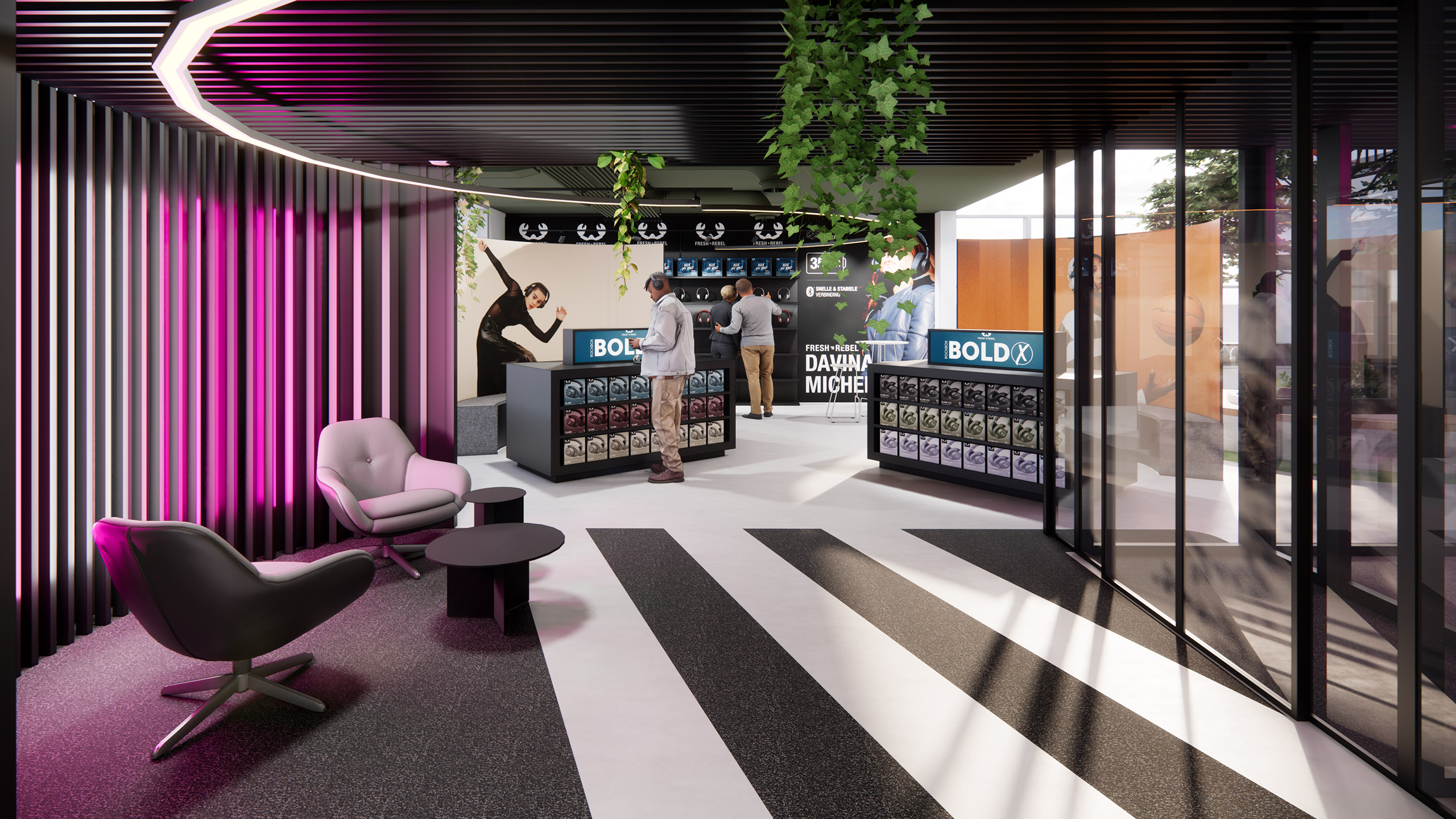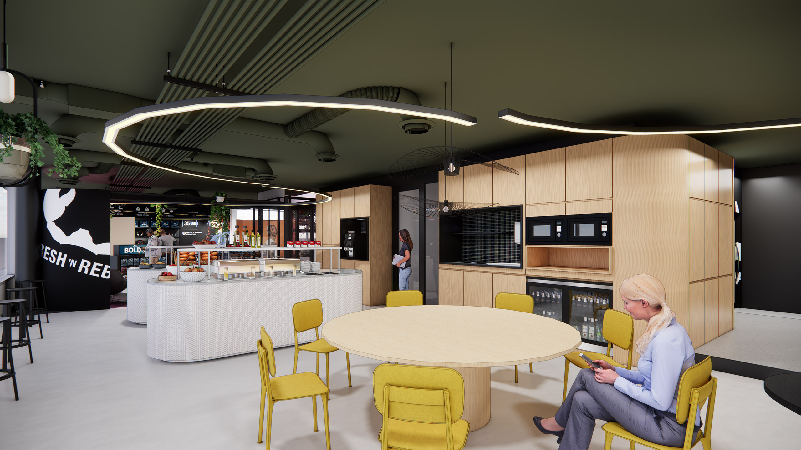 Een stoere mix van showroom en kantoor. Door de verhuizing naar een minder centraal gelegen plek is het meest belangrijke om een uitnodigend kantoor te maken dat de identiteit van Fresh overal uitstraalt. Van entree tot trappenhuis, overal voel je dat je bij Fresh ’n Rebel bent. Medewerkers komen daardoor graag naar kantoor, en zijn trots op hun eigen merk.