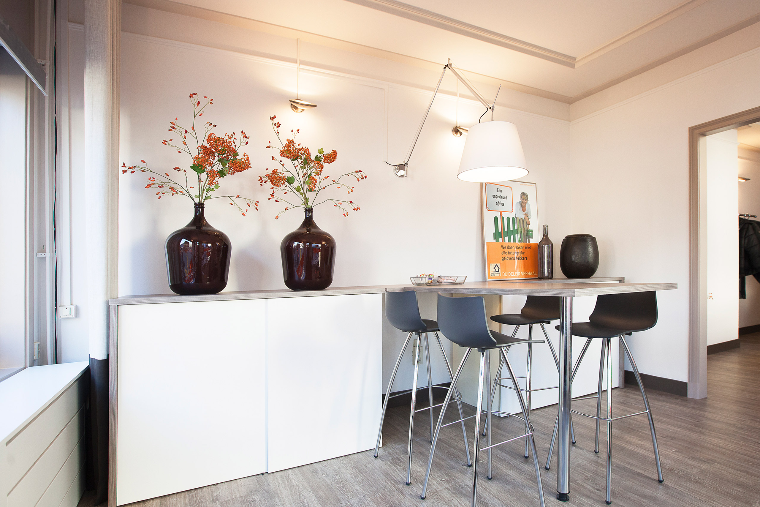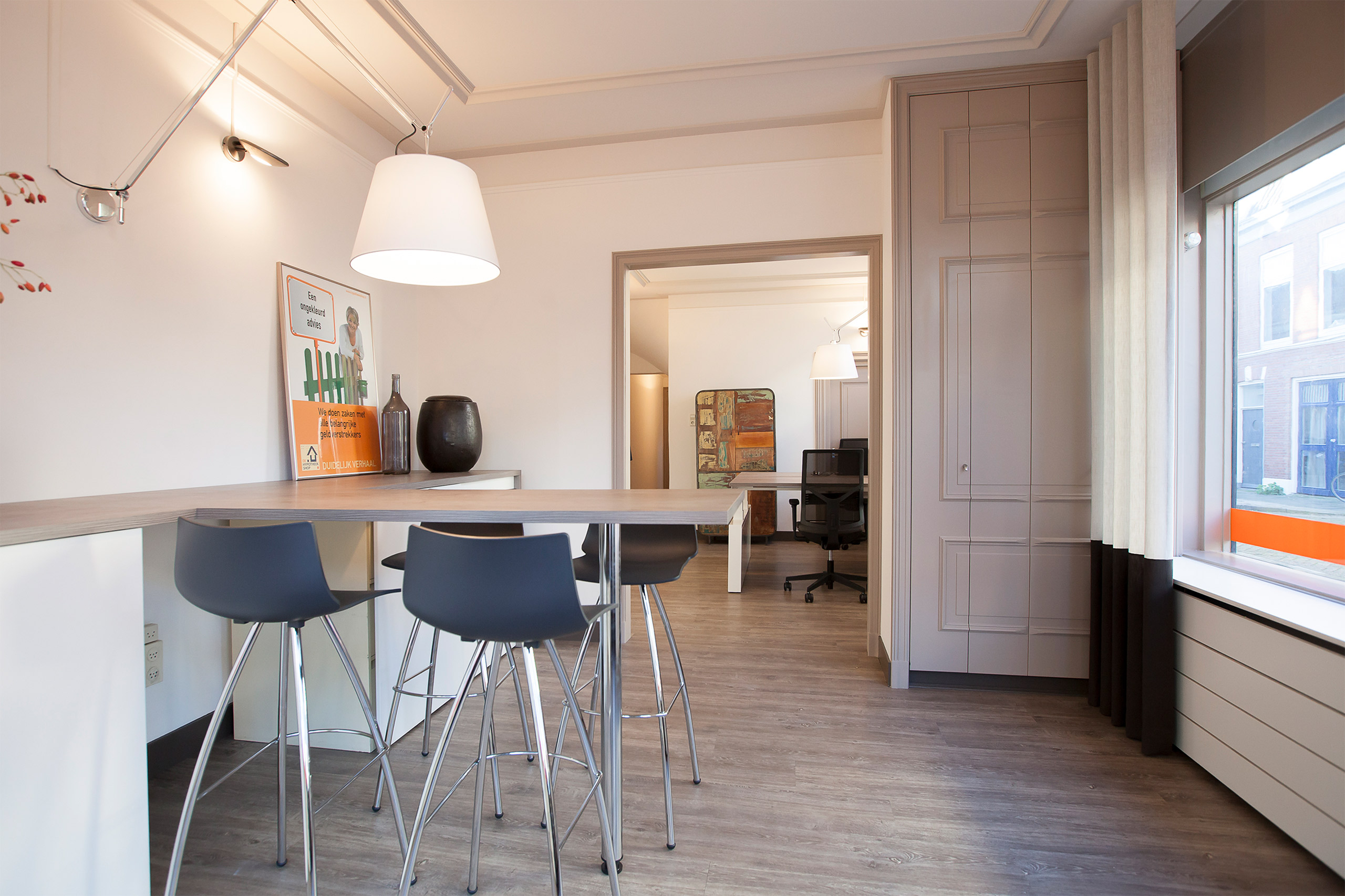 Dit kleine kantoor heeft een volledige andere uitstraling gekregen. Simpele ingrepen als een radiatorombouw, aanvullende verlichting en een nieuw kleurenschema maken er een eigentijdse maar klassieke omgeving van.