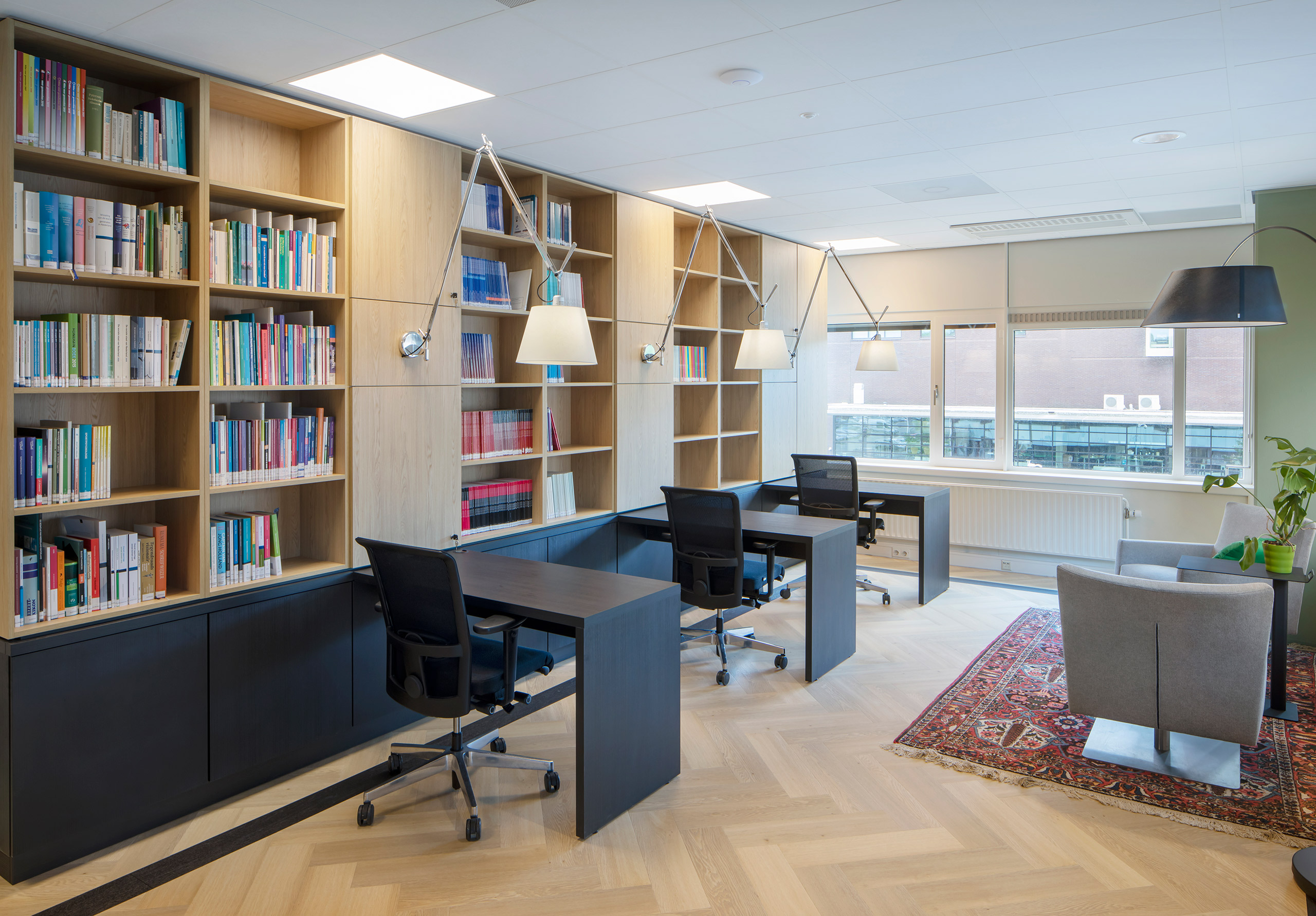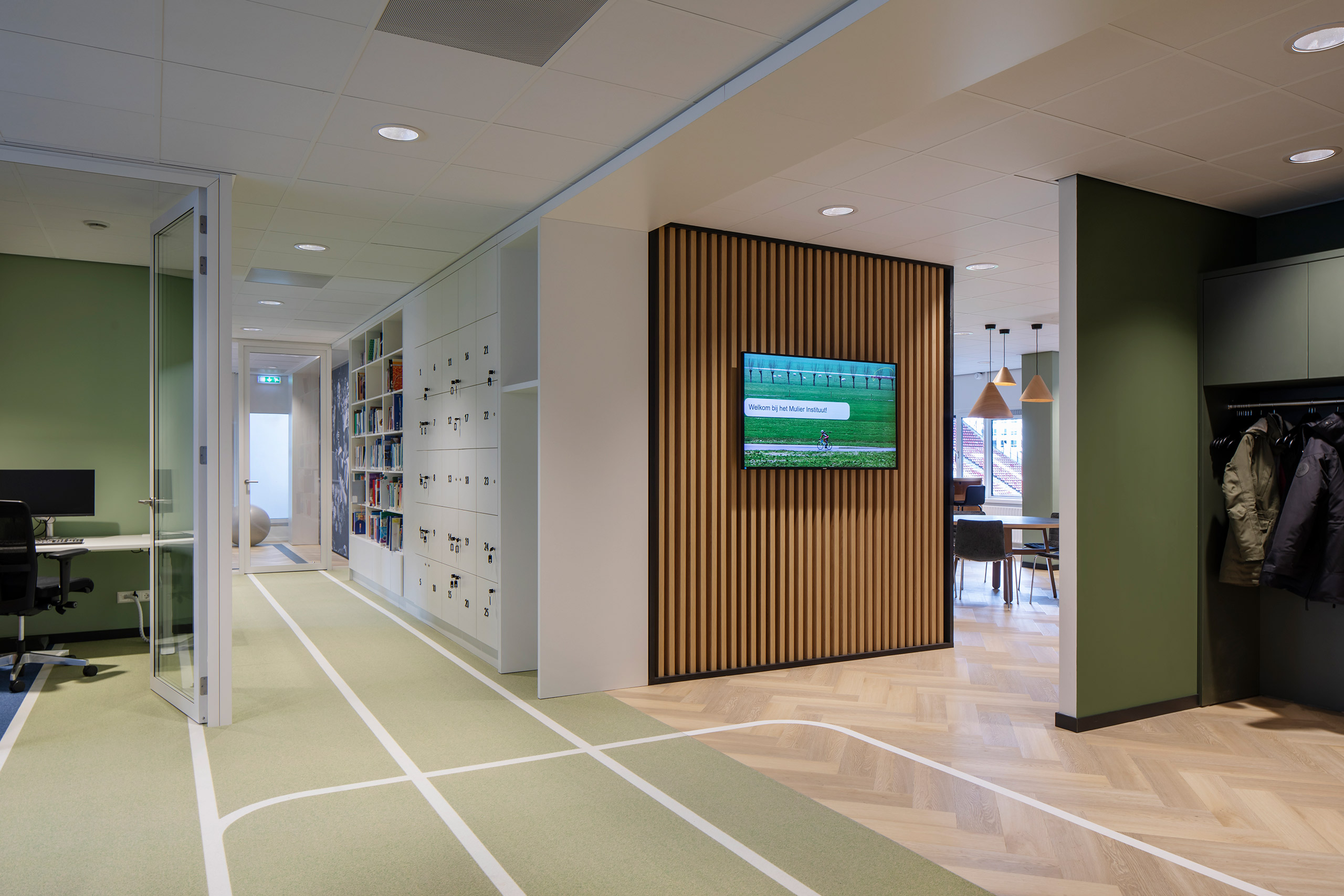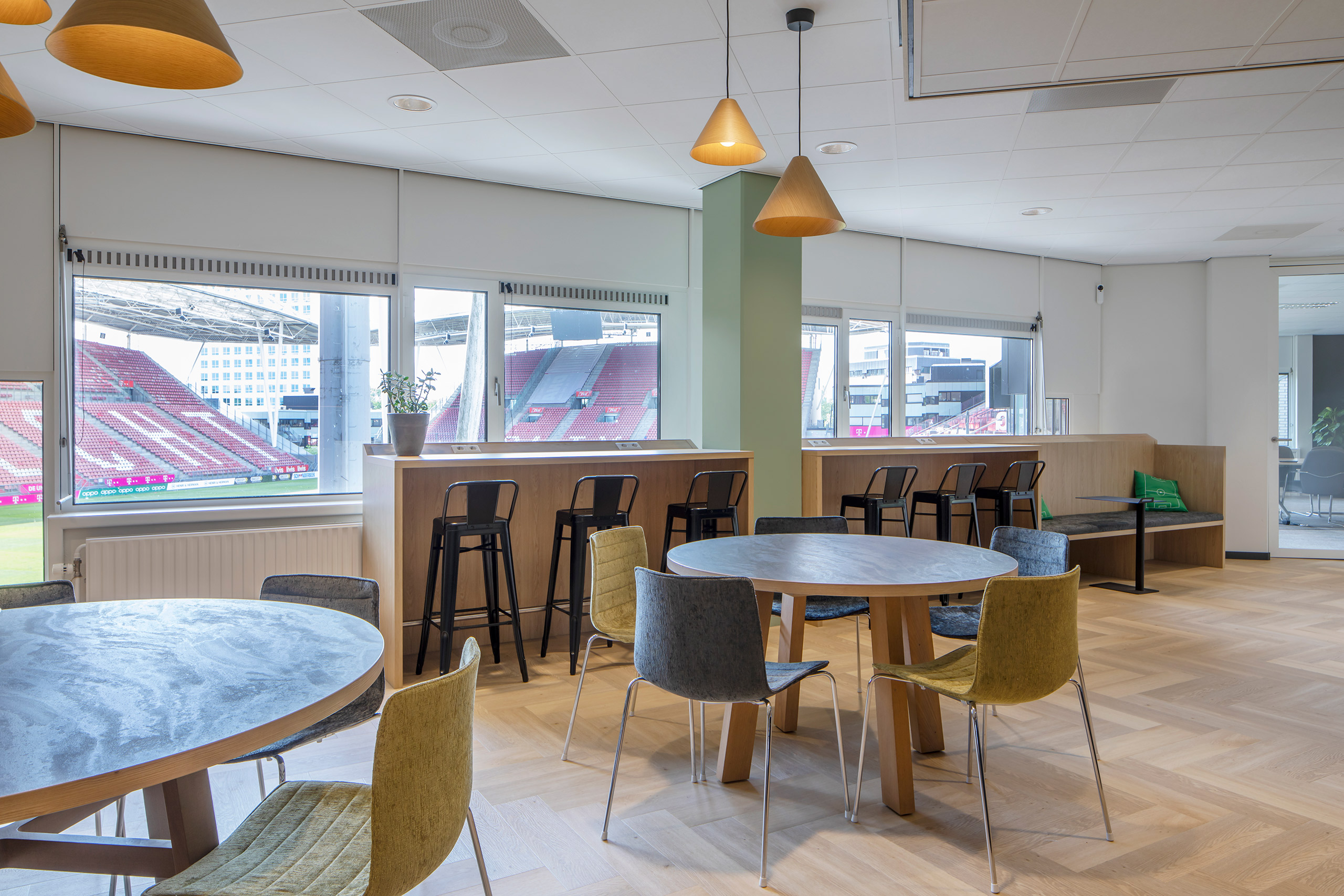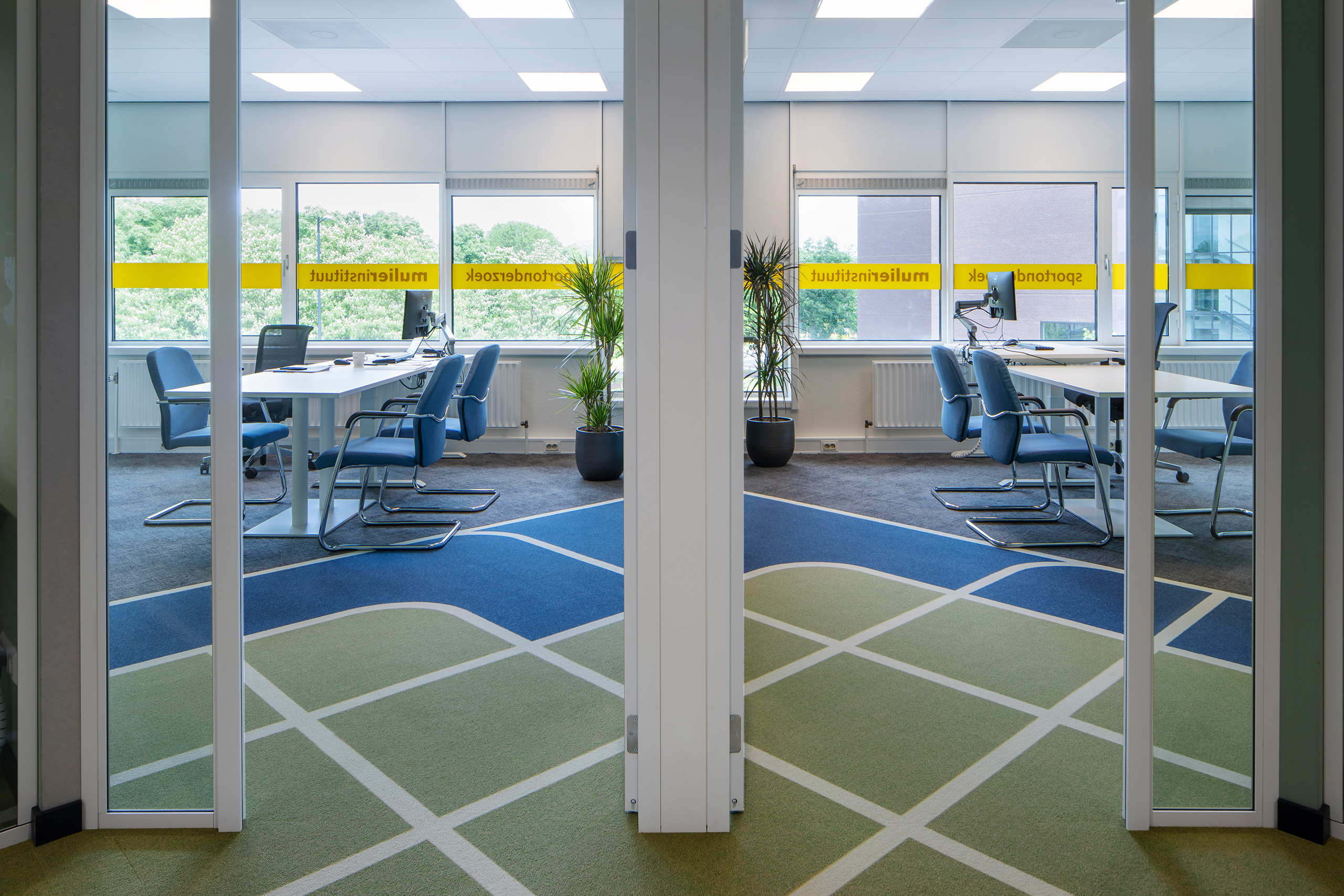 Met veel plezier heeft buroDesk zoveel mogelijk een circulair ontwerp gemaakt voor het Mulier Instituut. Niet alleen letterlijk (je kun een rondje lopen, of rennen, rondom de kern) maar vooral figuurlijk. Er is zoveel mogelijk gebruik gemaakt van de bestaande onderdelen, bij alle materiaalkeuzes is voor een milieuvriendelijke optie gekozen en alle meubels zijn second life. De boekenwand (van de bestaande boekenkasten) loopt als een witte lijn door de gang, zodat de onderzoeksmaterialen voor iedere bezoeker inzichtelijk en toegankelijk zijn. De echte eye-catcher blijft natuurlijk het uitzicht, je zit op de tribune in het Galgenwaard stadion!