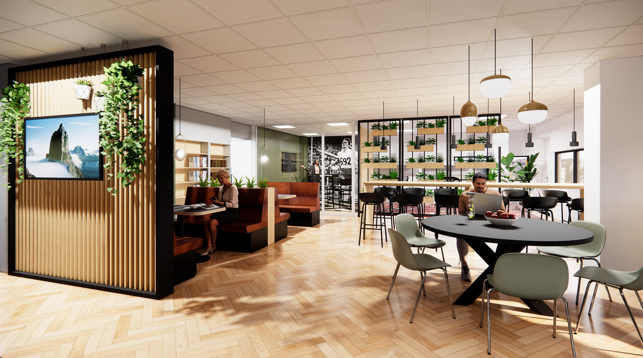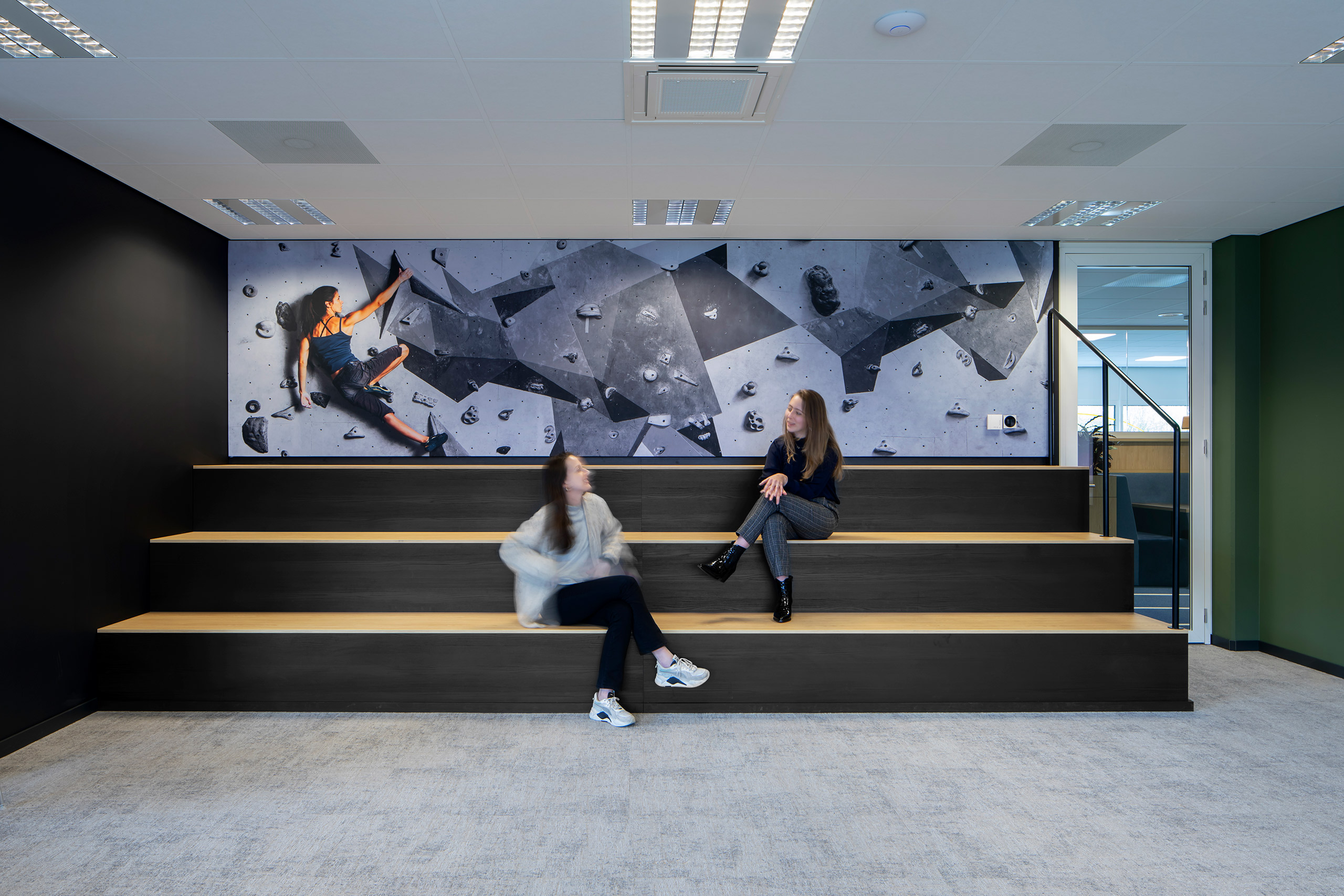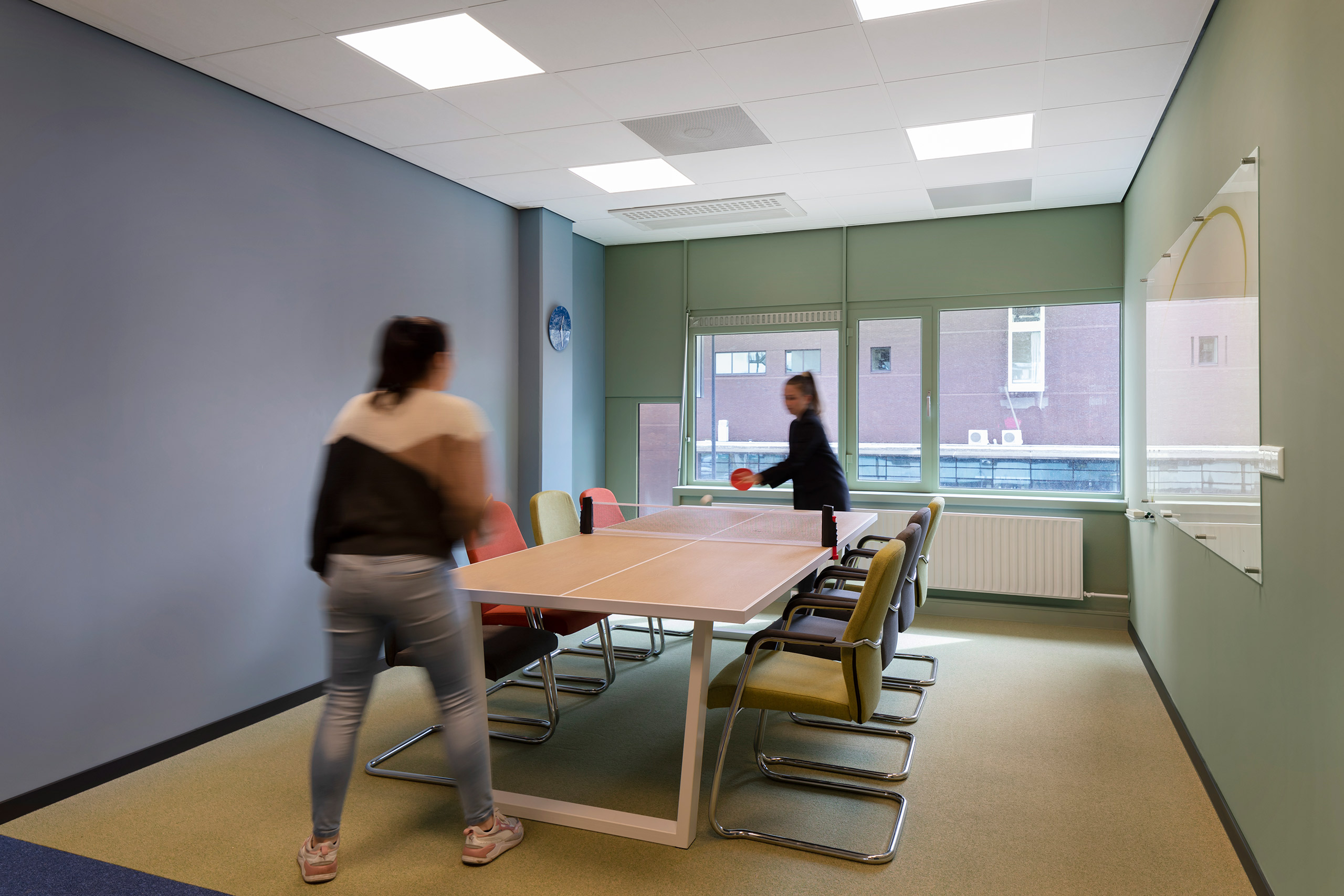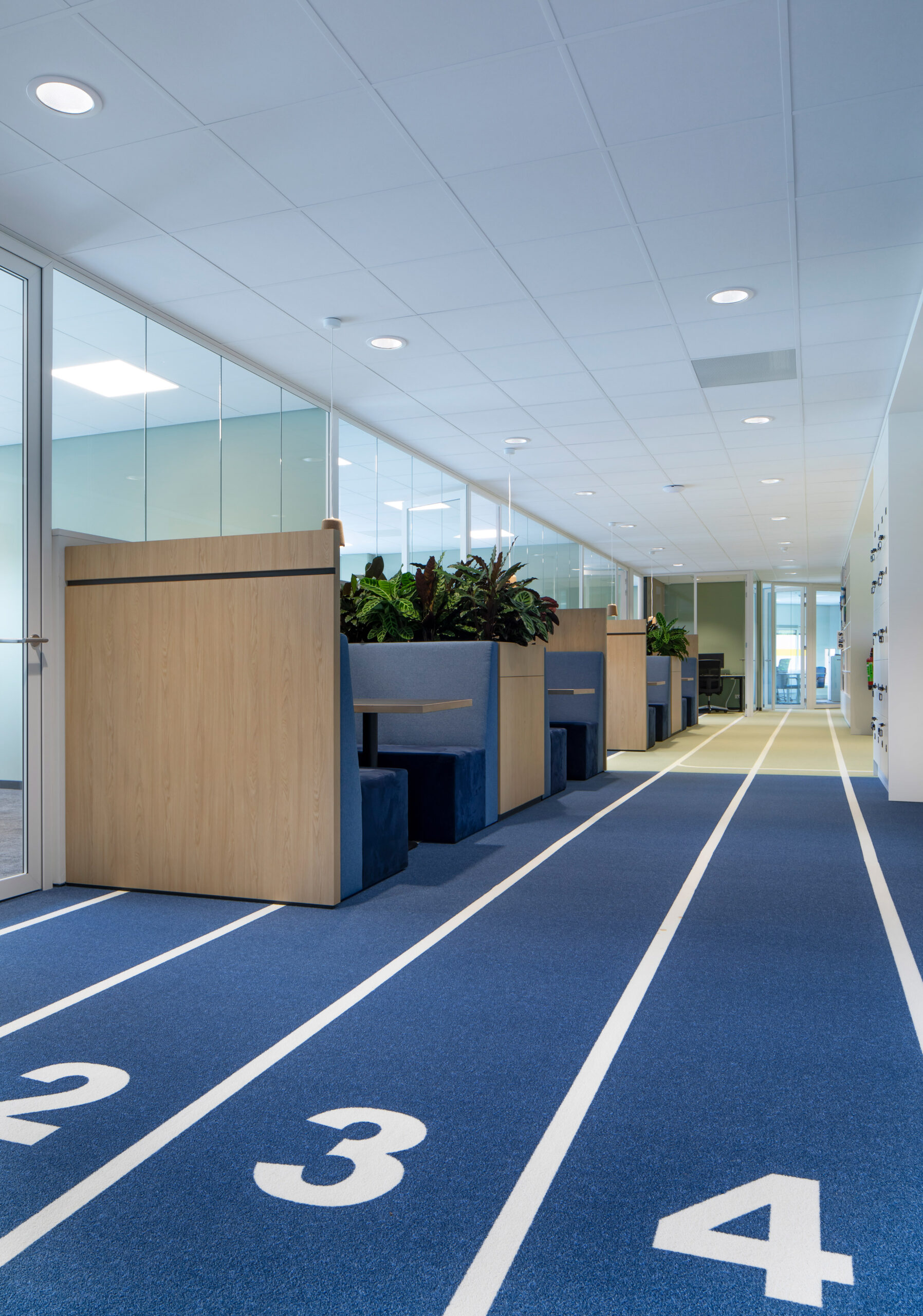 Met veel plezier heeft buroDesk zoveel mogelijk een circulair ontwerp gemaakt voor het Mulier Instituut. Niet alleen letterlijk (je kun een rondje lopen, of rennen, rondom de kern) maar vooral figuurlijk. Er is zoveel mogelijk gebruik gemaakt van de bestaande onderdelen, bij alle materiaalkeuzes is voor een milieuvriendelijke optie gekozen en alle meubels zijn second life. De boekenwand (van de bestaande boekenkasten) loopt als een witte lijn door de gang, zodat de onderzoeksmaterialen voor iedere bezoeker inzichtelijk en toegankelijk zijn. De echte eye-catcher blijft natuurlijk het uitzicht, je zit op de tribune in het Galgenwaard stadion!