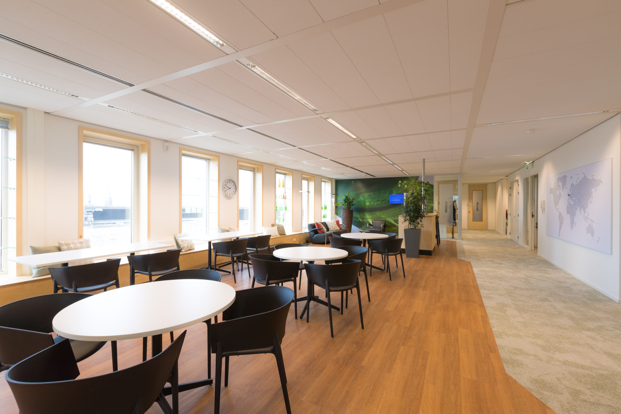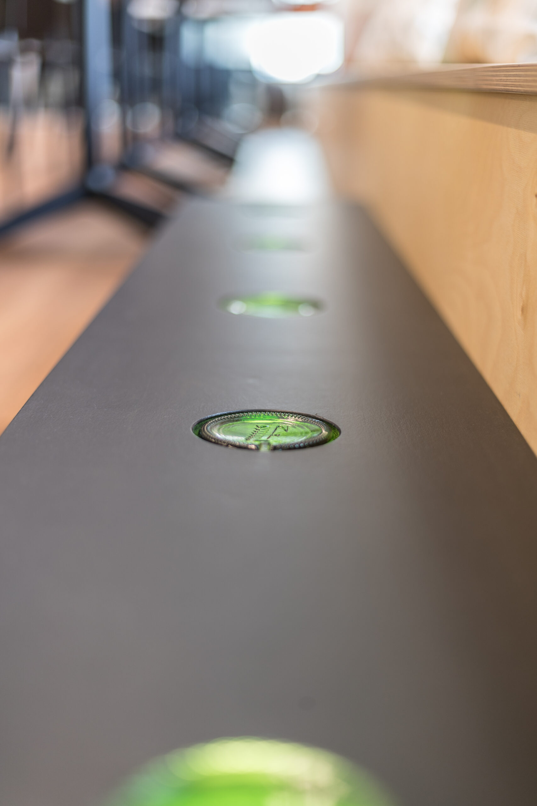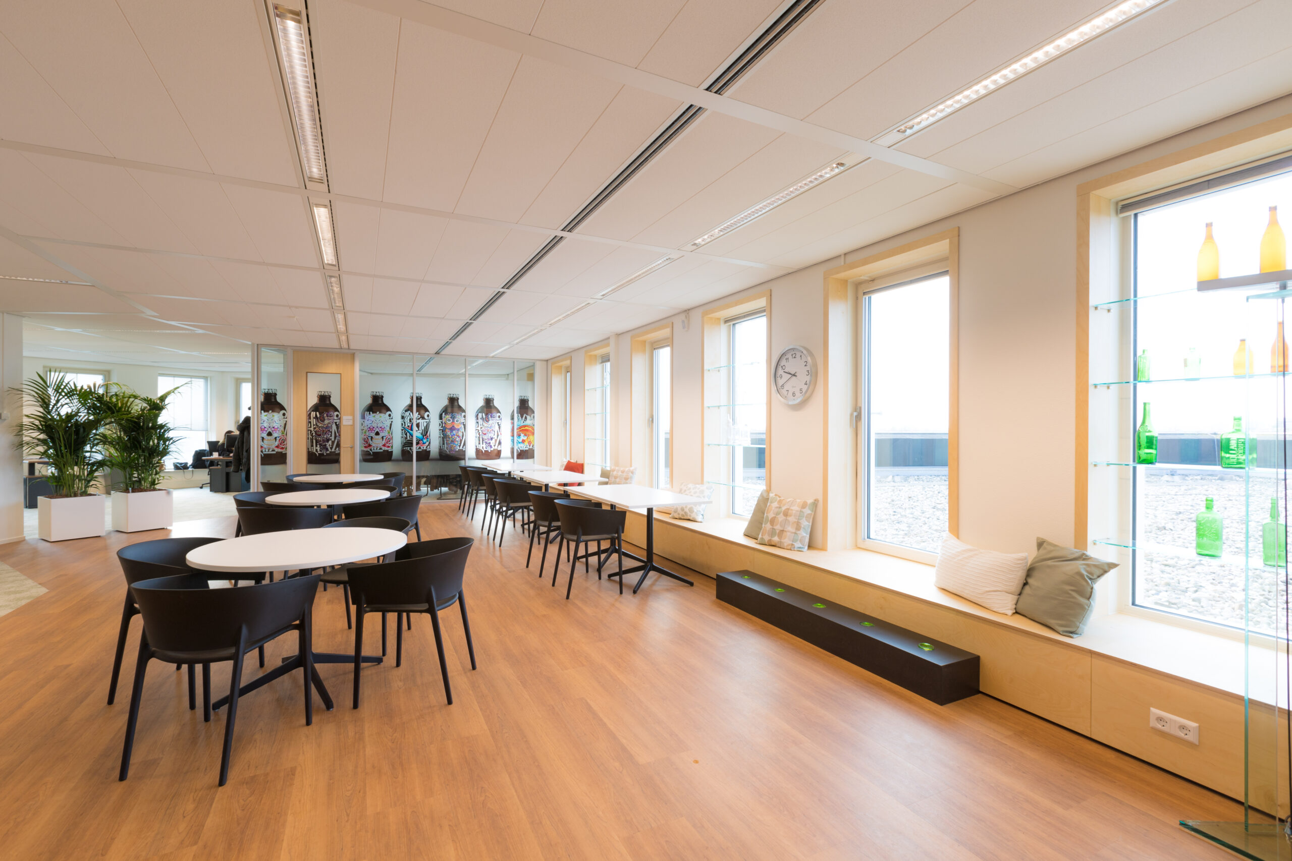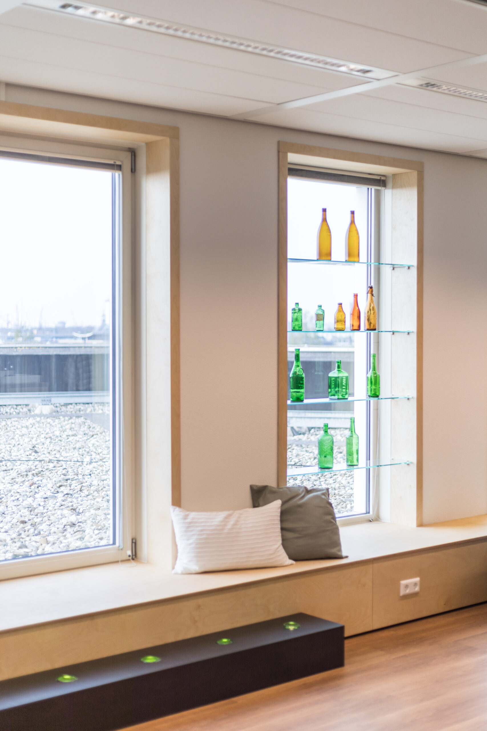 Met de verhuizing binnen Schiedam komt ook het afscheid van de historische productielocatie. Toch blijft het product hier centraal staan, het glas komt overal terug. Het interieur maakt optimaal gebruik van de unieke eigenschap van glas: transparantie. Zo zijn de diepe raamnissen ingezet als vitrines, zie je glazen flesbodems in de trap en is 1 van de oude trappanelen nu zichtbaar in het koffiemeubel.