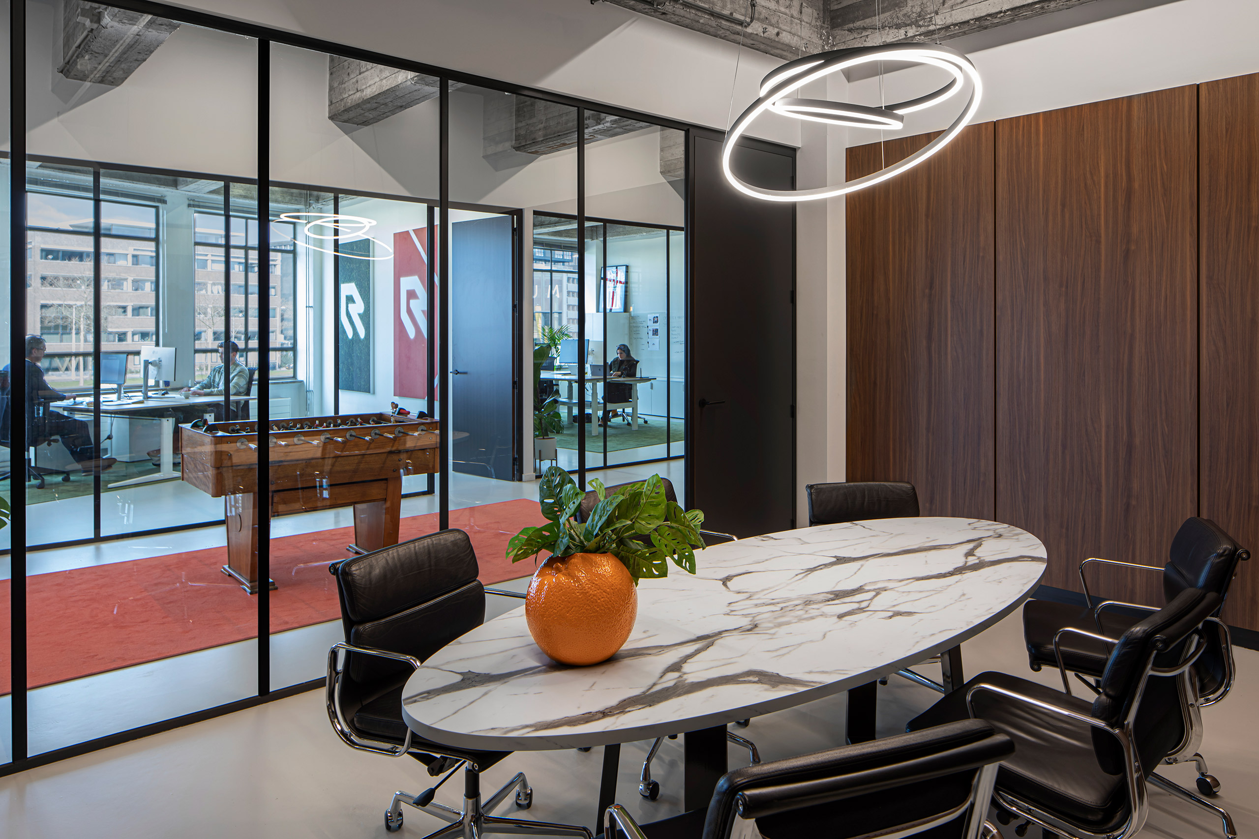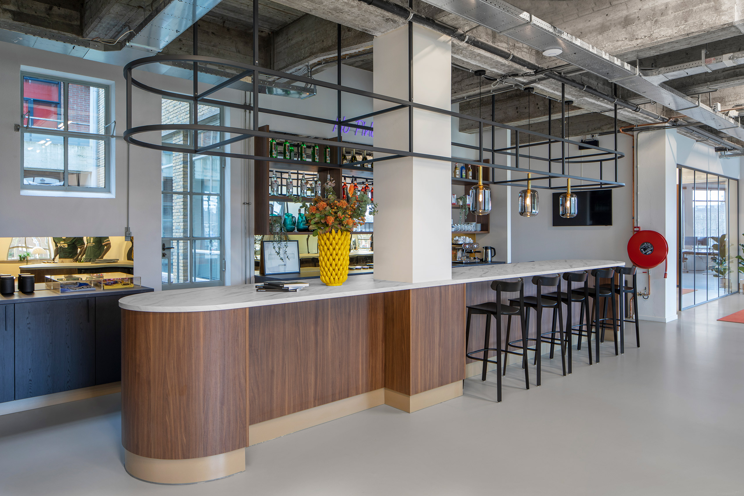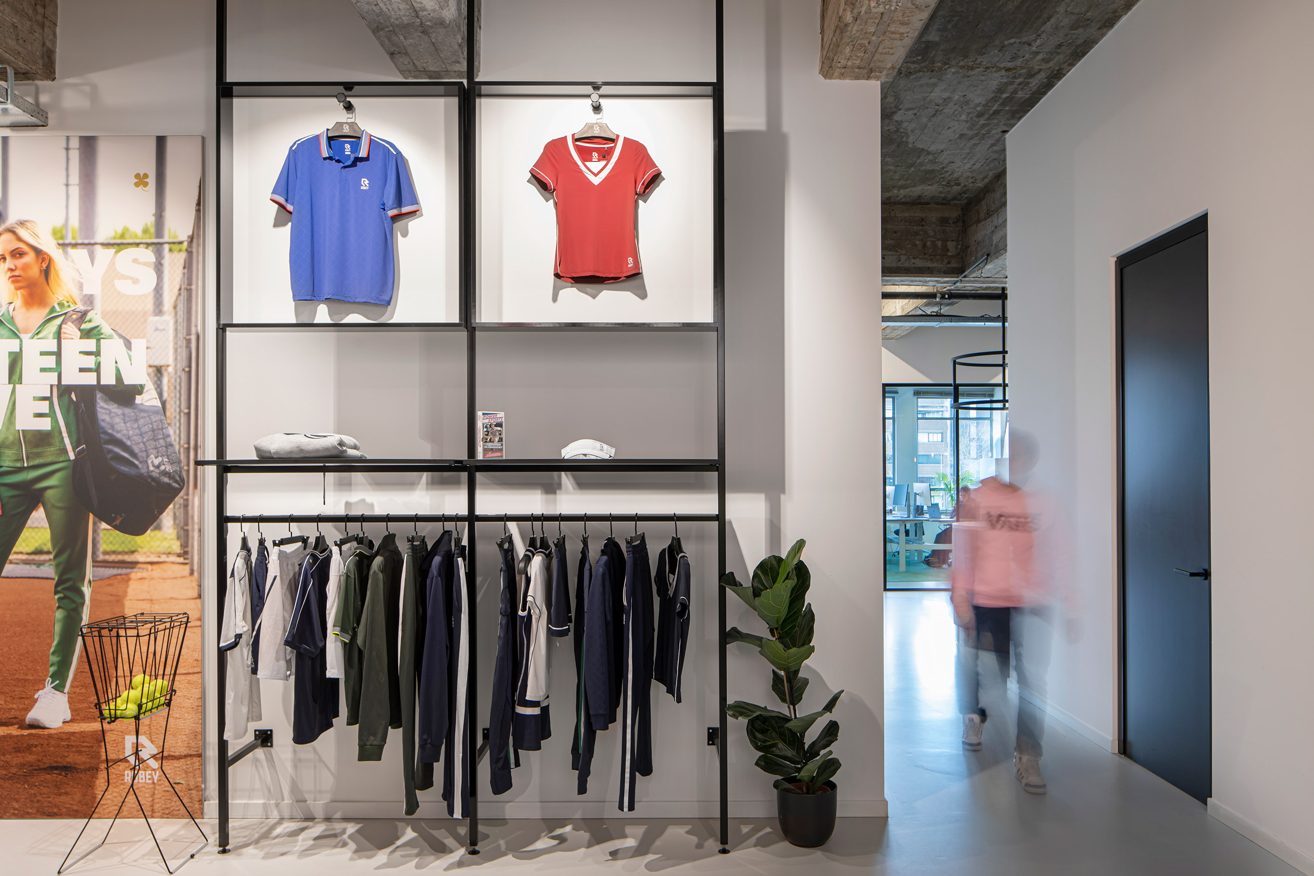 Als producent van sportkleding straalt de nieuwe inrichting van Robey uit waar het merk voor staat: hoogwaardig met sportieve accenten. Met veel aandacht voor details zie je de kwaliteit er aan af, net zoals bij de sportkleding zelf. In het stoere gebouw komen alle functies samen, met de bar als centraal ontmoetingspunt.