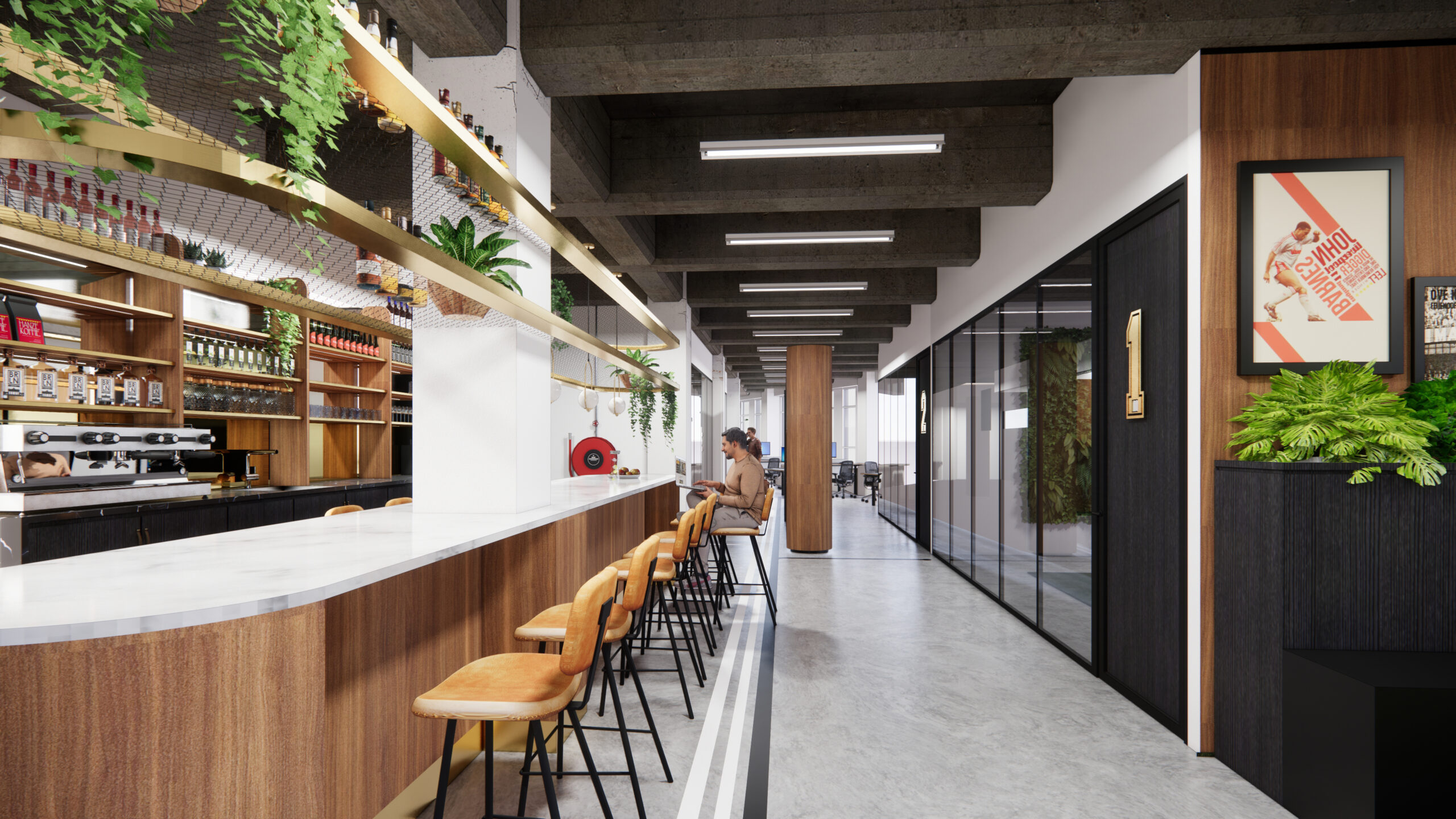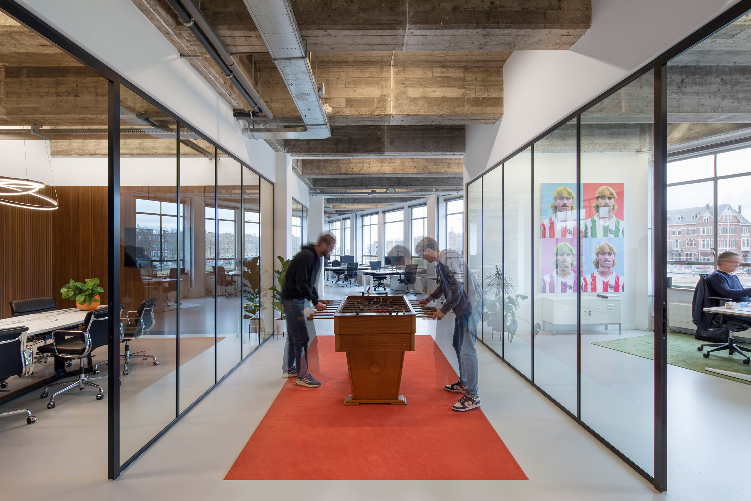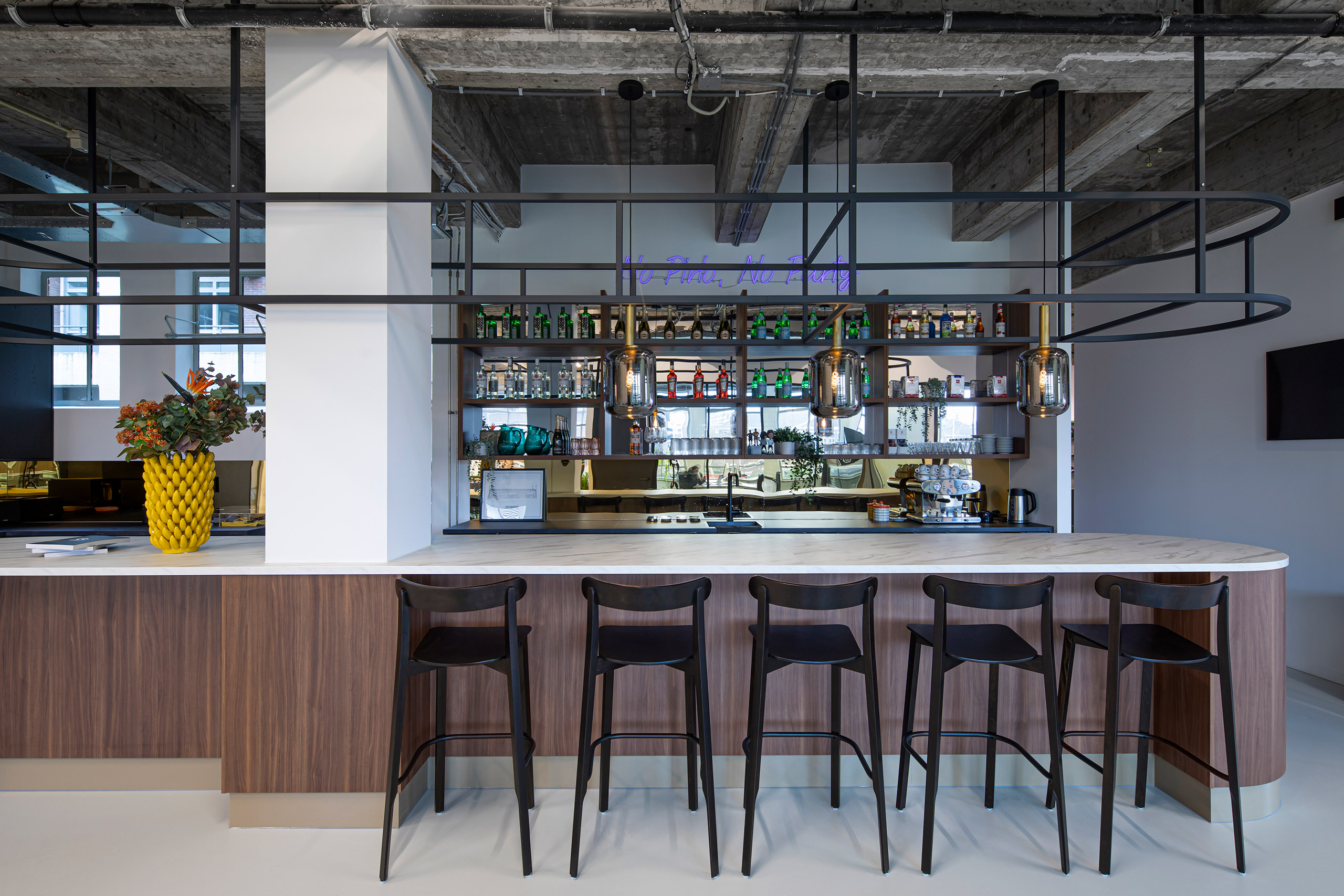Als producent van sportkleding straalt de nieuwe inrichting van Robey uit waar het merk voor staat: hoogwaardig met sportieve accenten. Met veel aandacht voor details zie je de kwaliteit er aan af, net zoals bij de sportkleding zelf. In het stoere gebouw komen alle functies samen, met de bar als centraal ontmoetingspunt.