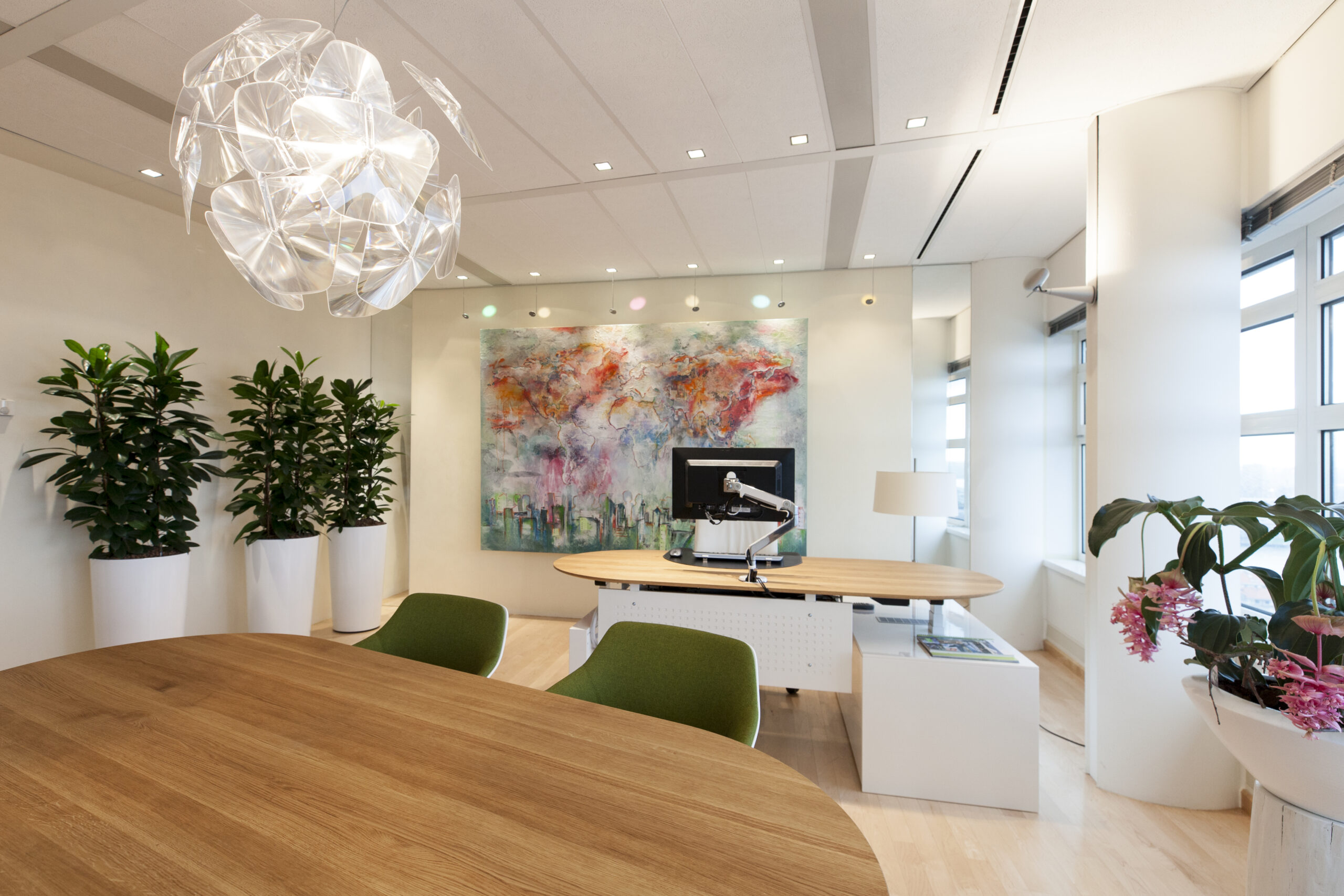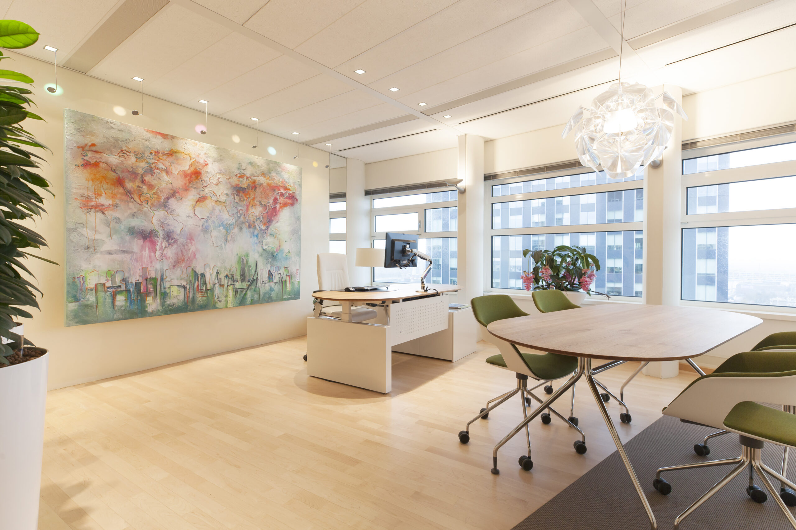 Een lichte maar warme kamer voor de directeur Communicatie & Organisatieontwikkeling, waar bezoekers zich welkom voelen en die een persoonlijke touch heeft. Deze vraag is vertaald door het persoonlijke kunstwerk van Wilma Veen centraal achter de werkplek te plaatsen, zodat je meteen als je binnenkomt je prettig voelt. Licht en groen helpen daarbij. Een hele fijne (en ergonomische!) werkplek op een prachtige plek in Rotterdam.