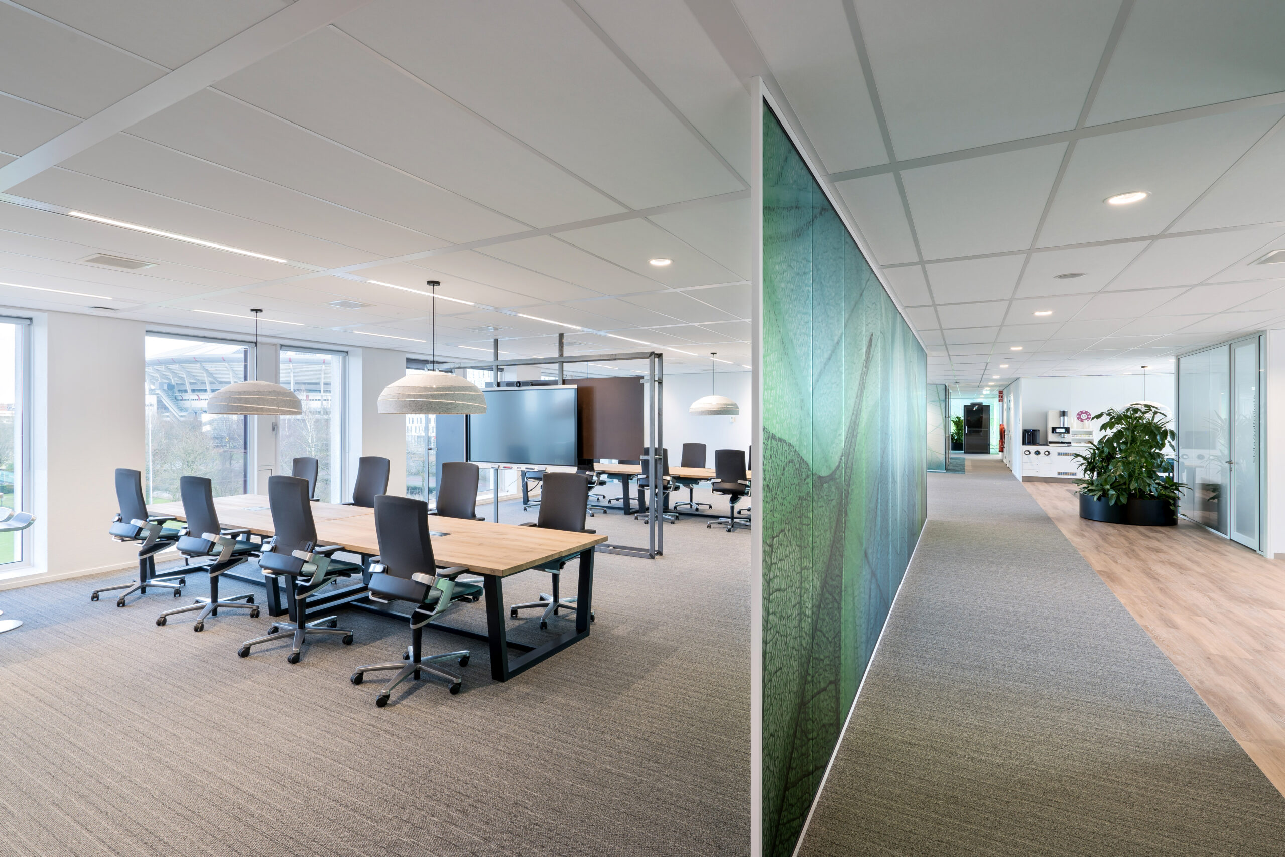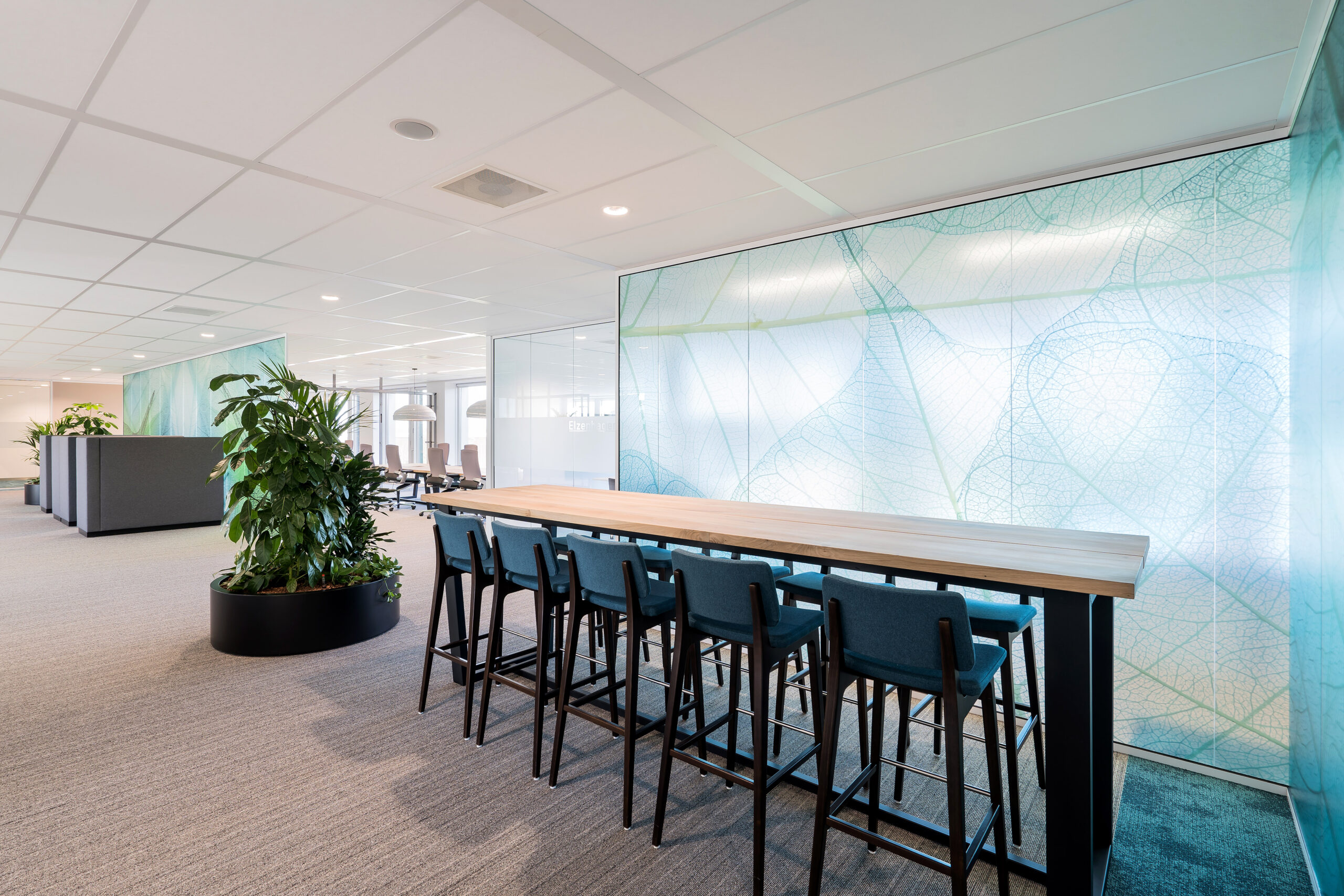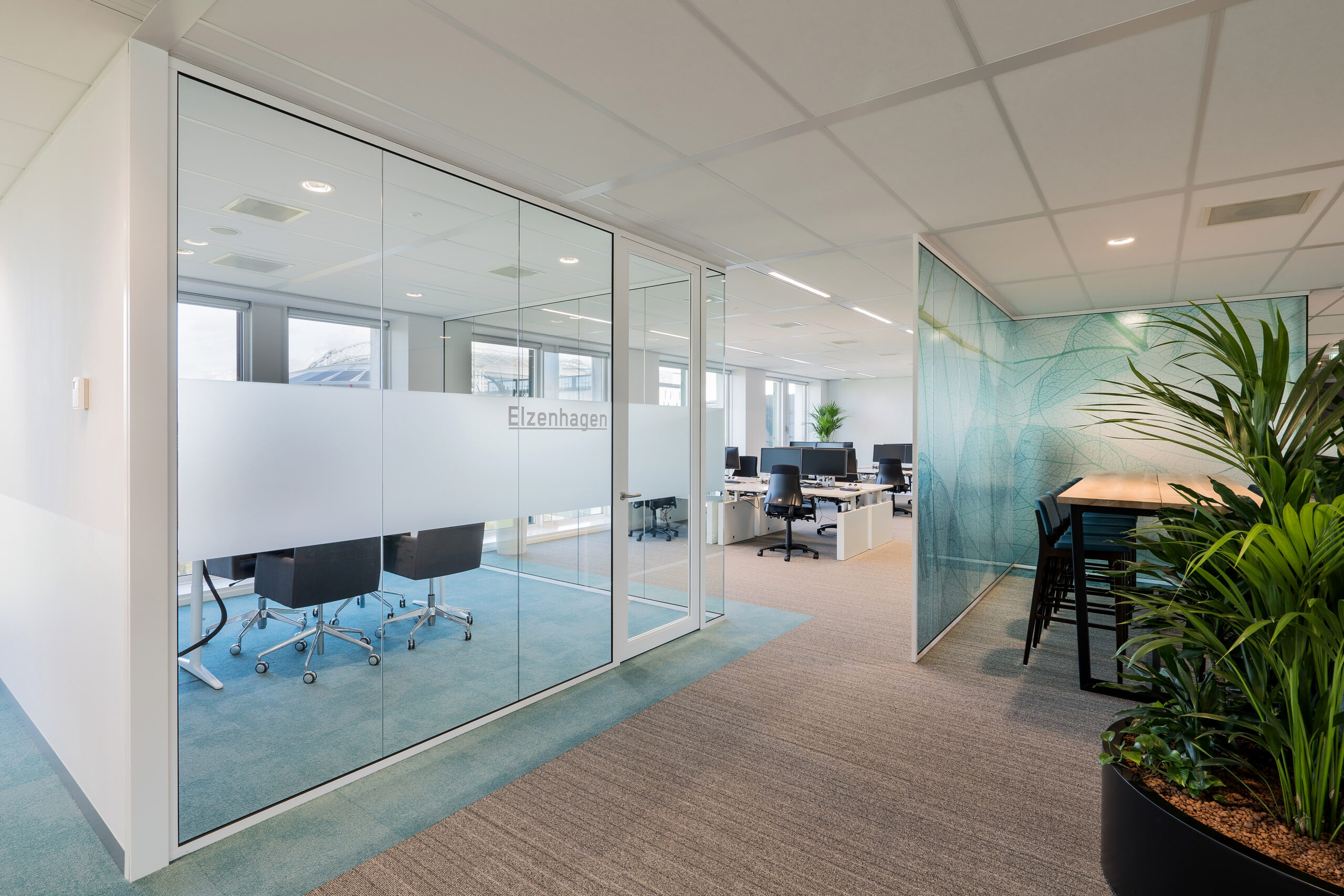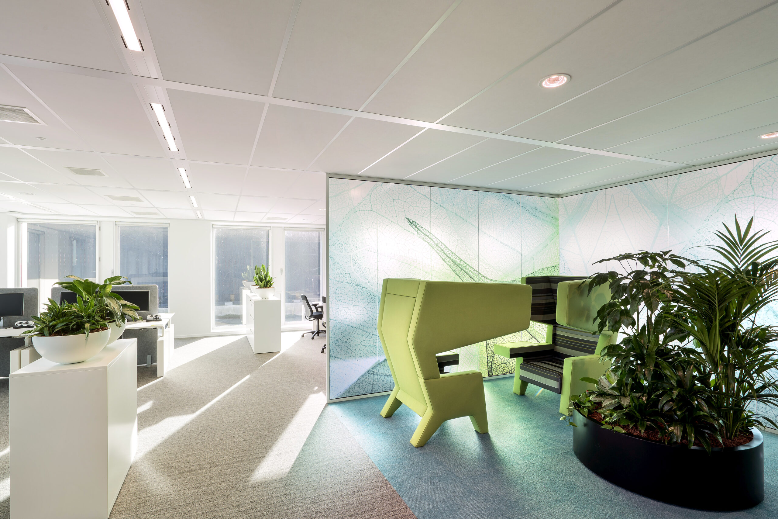 Het ontwerp van dit kantoor is gebaseerd op een nieuwe manier van werken voor de klant. Een duidelijke verdeling in 3 gebieden: stil werken, ontmoeten en samenwerken en tenslotte rustig bureauwerk. De drie gebieden zijn van elkaar gescheiden door overlegruimtes, concentratieruimtes en veel groen. Dit project is tot stand gekomen in samenwerking met Architectenburo VOM, in opdracht van Human Office.